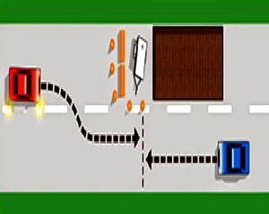 | 2. จากรูป หากรถคันสีแดง และรถคันสีเหลืองต้องการจะเลี้ยวขวาในเวลาเดียวกัน รถคันใดจะมีสิทธิไปก่อน