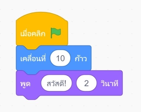 1) ก. ตัวละครพูดว่าสวัสดี 2) ข. ตัวละครเคลื่อนที่ไปข้างหน้า 10 ก้าว แล้วพูดว่า ขอบคุณ 3) ค. ตัวละครเคลื่อนที่ไปข้างหน้า 10 ก้าว แล้วพูดว่า สวัสดี 4) ง. ตัวละครทำท่าคิด และก้าวไปข้างหน้า 10 ก้าว