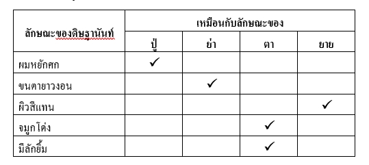 1. จากข้อมูล ลักษณะในข้อใดที่ ด.ช. ดิษฐานันท์ได้รับการถ่ายทอดลักษณะทางพันธุกรรมมาจากคุณพ่อ