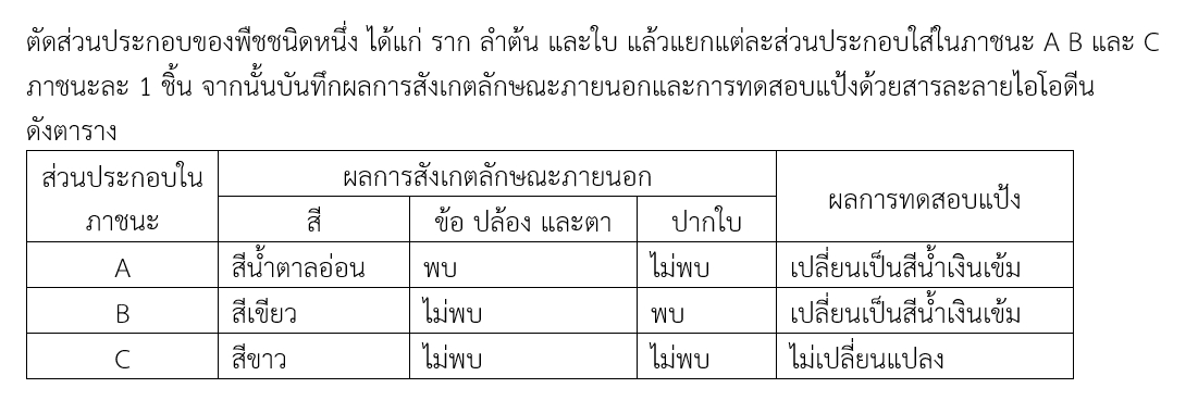 | 2. หากต้องการวาดส่วนประกอบที่มีโครงสร้างทำหน้าที่คายน้ำและทำหน้าที่ดูดน้ำ ของพืช ควรเลือกส่วนประกอบในภาชนะใดมาวาด ตามลำดับ