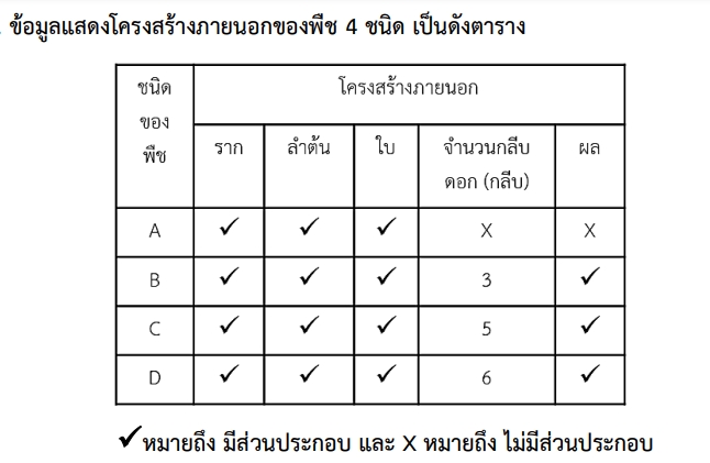 1) พืช A เป็นพืชไม่มีดอก ส่วน B เป็นพืชใบเลี้ยงเดี่ยว 2) พืช B เป็นพืชใบเลี้ยงเดี่ยว ส่วนพืช D เป็นพืชใบเลี้ยงคู่ 3) พืช B เป็นพืชใบเลี้ยงคู่ ส่วนพืช C เป็นพืชใบเลี้ยงเดี่ยว 4) พืช C เป็นพืชใบเลี้ยงเดี่ยว ส่วนพืช A เป็นพืชไม่มีดอก