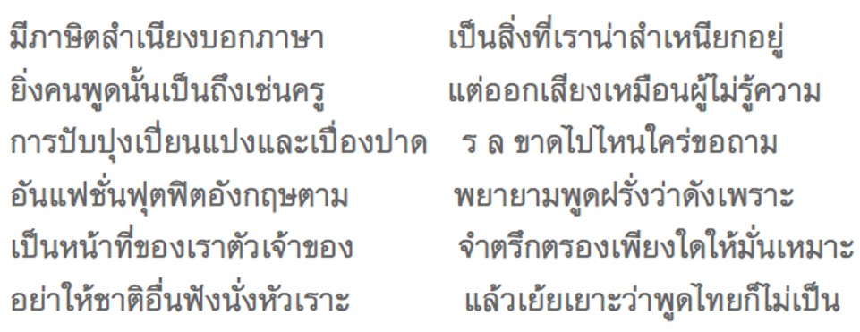 1) ครูควรตระหนักในความสำคัญของภาษาไทย 2) ครูควรพูดภาษาไทยให้ชัดเจน 3) ครูไม่ควรพูดภาษาไทยปนภาษาอื่น 4) ครูมีหน้าที่อนุรักษ์ภาษาไทย